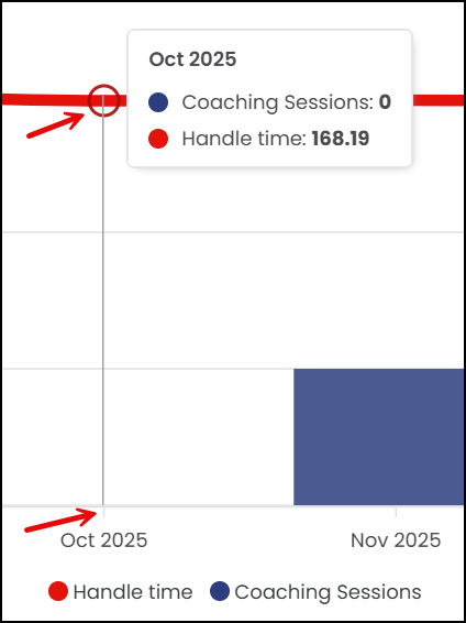 Hovering over any area of the red KPI metric line that lines up with tick marks on the x-axis also displays the number of coaching sessions and the KPI metric for that data point. -