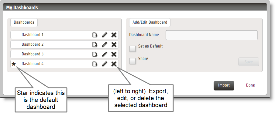 NOTE If you import a dashboard with the same name as one of your existing dashboards, an asterisk is appended to the imported dashboard’s name.