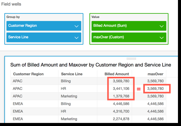 ) The following example shows the maximum Billed Amount over Customer Region. The fields in the table calculation are in the field wells of the visual.