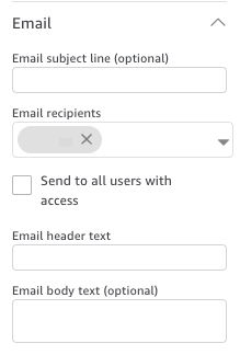 In Email recipients, enter the email addresses of the Insights group name of the users or groups that you want to receive the report. You can also select the Send to all users with access box to send the report to everyone that has access to the dashboard in your account.