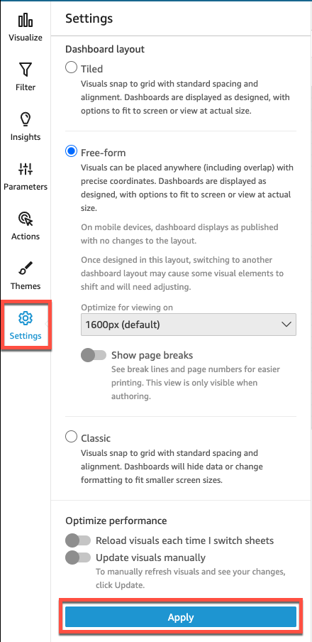 In the Settings pane, under Dashboard layouts, select the layout that you want.