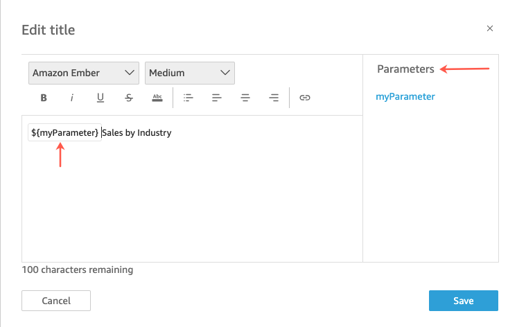 When you create parameters in Insights, you can use them in titles and descriptions throughout your charts and analyses to dynamically display parameter values.