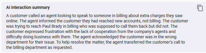 Click the Interaction insights overview tab. The AI interaction summary section summarizes the contact. Most summaries are approximately 150 words, but some summaries might be longer or shorter depending on the length of the contact’s transcript.