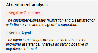Click the Interaction insights overview tab. The AI sentiment analysis section shows the sentiment (emotions) expressed by both the customer and the agent. It indicates positive, negative, or neutral sentiment for both parties and explains why Webex WFO assigned this sentiment.