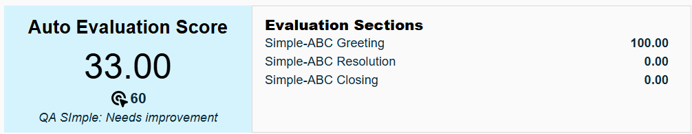 Click the AI conversation overview tab. The Auto Evaluation Score sections shows the overall score that Webex WFO gave to the contact. The Evaluation Sections section shows the score that Webex WFO gave to each section within the evaluation form that it used to score the contact. Depending on how the form was configured, you might also see the target score for the form and the name for the scoring band that the score falls into (see Manage forms for AI evaluation).