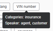 (Optional) Hover over a tag to see the category that the tag belongs to and the speaker (agent or customer) whose contribution to the conversation prompted Webex WFO to apply the tag.