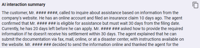 - (For audio contacts) An administrator has created an ongoing Analytics speech-to-text task with AI Interaction Summary enabled (see Turn on Interaction Summary or Create Analytics tasks).