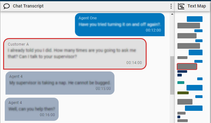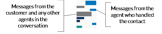 The Text Map panel contains colored rectangles that represent the messages in a chat contact. This panel gives you a high-level picture of the conversation without needing to scroll. The responses from the agent who handled the contact are on the right, and responses from the customer and any other agents involved in the conversation are on the left. The messages from each person in the conversation are a different color for up to four different participants. (If a conversation has five or more participants, the colors repeat.)