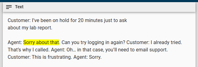 In the Text panel, you can review text-based contacts that your agents handled. Phrase hits from Text Analytics tasks are highlighted in yellow.