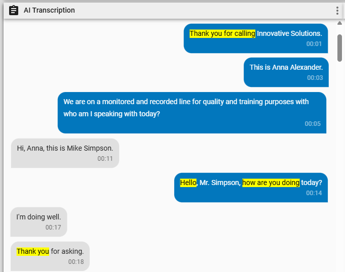 In the AI Transcription panel, you can review the transcription of an audio recording. The panel displays this transcription as text bubbles. When you play back a recording, Webex WFO highlights the text bubble of the current speaker.