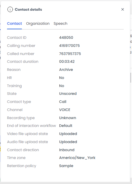 The Contact Details window in the new media player contains many kinds of data associated with the contact. The information available depends on your role, the contact type and contents, and the features your organization uses in Webex WFO.