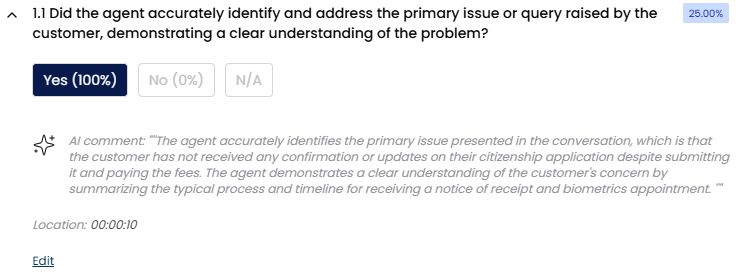- Click Save. The scores for the question, the section, and the form update, and the comment you entered replaces the AI’s comment.