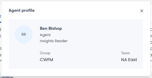 Click the agent’s name in the upper-left corner of the page. The Agent profile card opens, showing the agent’s assigned roles and their team and group.