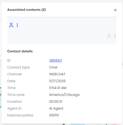 The Associated contacts window opens visualizing all the different contacts that are part of this conversation in chronological order, with the contact you have open in blue. - To view details about the associated contacts, click a person icon.