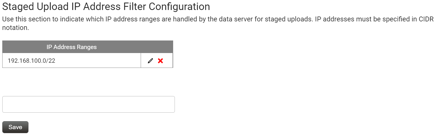 In the Staged Upload IP Address Filter Configuration section, enter at least one range of IP addresses in CIDR notation. Any agent whose PC has an IP address matching this range is associated with the Staged Upload Data Server.